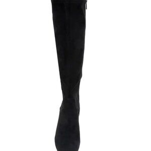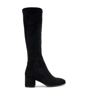 Knee-high boot constructed from stretchy faux suede with an easy side-zip closure and block heel.