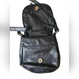 Kenneth Cole Reaction Faux Leather Crossbody Bag. Faux leather with fabric lining. Small crossbody style bag. Magnetic snap button closure with zipper pocket flap that goes deep. 3 inside pockets, one zipper.
