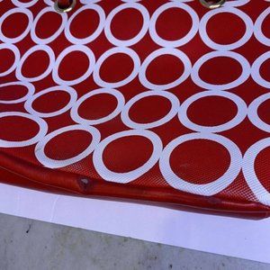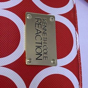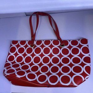 Kenneth Cole Reaction Medium Tote Bag. Nice red and white color with circle pattern. In good shape except for one small wear mark on the bottom, see photo.