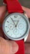 Elegant watch with a silver dial and bold red strap. Ideal for everyday wear.