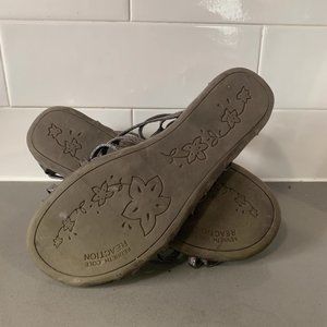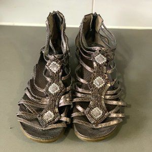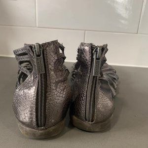 Only worn a couple of times, in great condition. Zip-up silver sandals with thick, cushy soles. Perfect to wear at an event where you're on your feet for long periods.