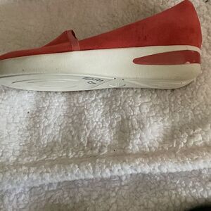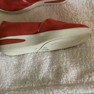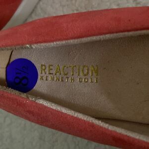 Kenneth Cole reaction shoes, they are slip on. They have been sitting in my closet for quite some time, the shoe itself is in excellent condition the insole on the right shoe seems to have come loose it needs to be re-glued, or an insole put in.I tried to get a picture of it just so I could let the person know who purchases them that it is a loose bottom of the shoe inside. Nothing that new insoles so I couldn’t fix. They are a beautiful salmon colour