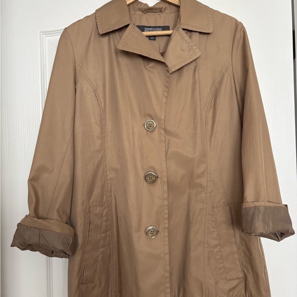 Stylish tan trench coat by Kenneth Cole Reaction. Features classic design with button closure. Perfect for versatile wear.