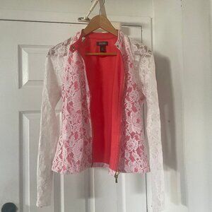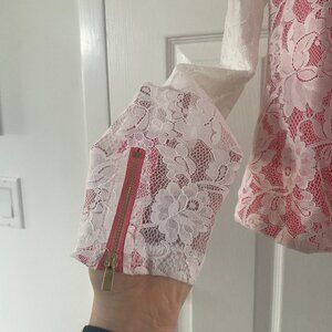 Arms are see-through lace, body has peekaboo pink/coral lining. Gold zipper enclosure and gold snap button at collar. Zipper detail on sleeves is functional and can be opened/closed.