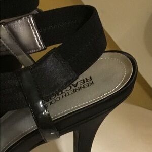 Open toe, black covered 4” heel with ankle strap, black minimalist design