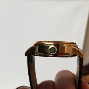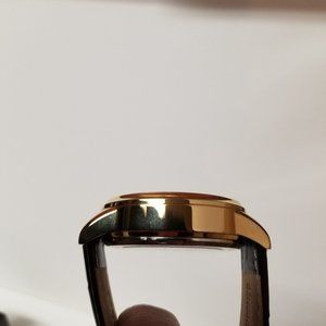 This is a Kenneth Cole wristwatch, made of gold-toned stainless steel, it is an automatic watch (powered by the movement of your wrist) it can also be wound up by rotating the crown, it has a glass backing on it so that you can see the inner working of the watch, and has a black textured dial with skeletonized portions, and has polished gold-toned hands.