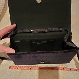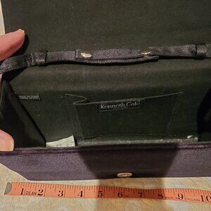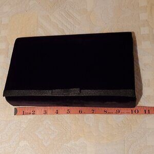 Kenneth Cole New York black velvet clutch purse with front satin bow detail, can use with long strap or as clutch; measurements in photos; used only once. perfect condition.
