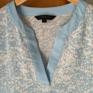 Pretty light blue with white abstract pattern. Sleeves can roll up w button. Light and flowy. Size L