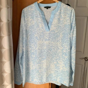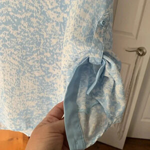 Pretty light blue with white abstract pattern. Sleeves can roll up w button. Light and flowy. Size L