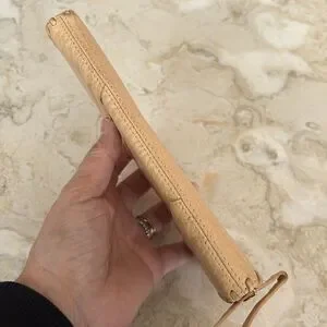 Lovely ivory/tan pebbled leather. Please note a couple of faint red marks as shown in last photo. Nothing major or even noticeable.