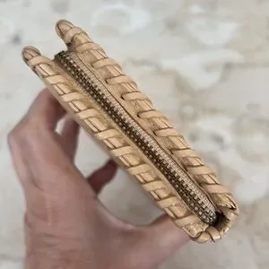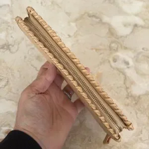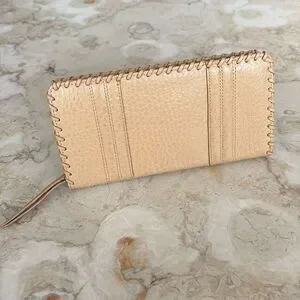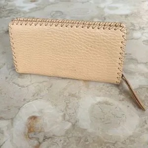 In excellent preowned condition Kenneth Cole long leather wallet. Boho styling with blanket leather stitch along the edges, zip closure, interior is clean with two slip pockets for paper currency, a zippered pocket, two full length open compartments and 8 credit card slots.