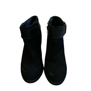 Suede with leather uppper textile lining.ankle length buckle boot. Side zipper. Rubber outsole. With issues with block heel soles.