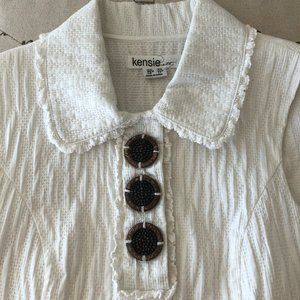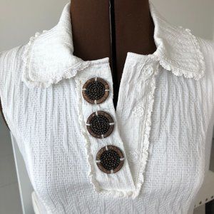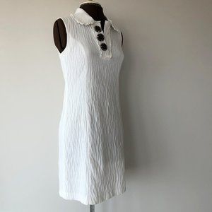 Kensie White Cotton blend sleeveless shift dress with peter pan collar, lace edging and buttons made out of wood/seed beading snap closure. Dress has stretch which allows for movement and comfort.