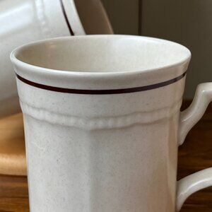 Description 🥐 4 vintage ironstone mugs. Light beige color with inclusions and brown rim.