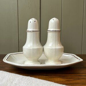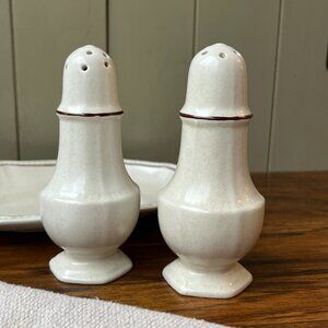 Description 🧂🧂 Vintage ironstone set of salt shaker, pepper shaker and underplate by Kensington Staffordshire (England). Light beige color with small gray inclusions, brown rim. One of the shakers has 6 holes, the other has 12 holes.