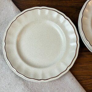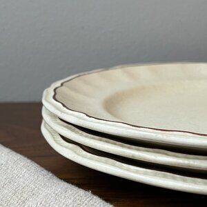 Description 🍰 3 vintage salad plates by Kensington Staffordshire (England). Light beige with small gray specks, brown rim.