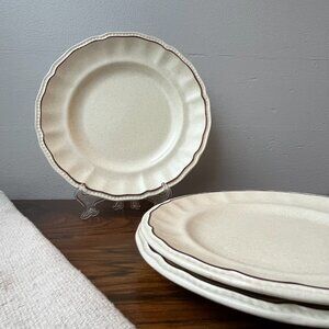 Description 🍰 3 vintage salad plates by Kensington Staffordshire (England). Light beige with small gray specks, brown rim.