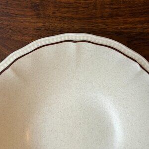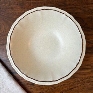 Description 🧆 Vintage serving bowl by Kensington Staffordshire (England). Light beige color with small gray inclusions, brown rim.
