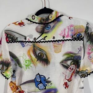 Extra keywords: kenzo shirt, statement shirt, designer print blouse, eye print shirt, grommet collar, kenzo graphic top, surreal print top, bold fashion, artistic fashion, runway look, eclectic style, luxury fashion