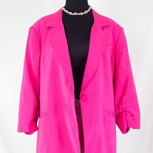 Single breasted, lined blazer with quarter length cinched sleeves. Padded shoulders. Side pockets, front chest pocket, back single vent. Four button details on sleeves.