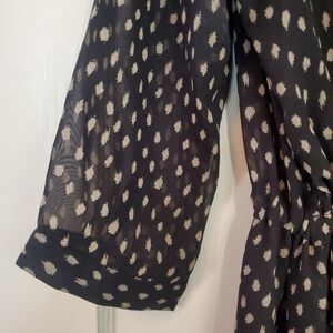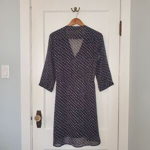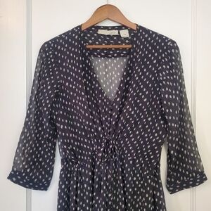This dress transitions easily from the office to after-work functions. It features 3/4 sleeves, and a V-neck with cloth-covered buttons. The adjustable drawstring creates an empire waistline that rises up in the front, creating a flattering, yet professional, fit.
