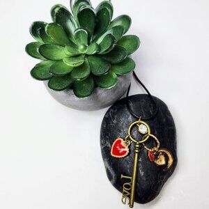So cute! The handcrafted necklace features a vintage style skeleton key and heart charms. Great for everyday, casual office or any occasion. This handcrafted adjustable corded necklace features a charming assortment of love-themed pendants. The centerpiece is a vintage-style key inscribed with 'Love,' complemented by a sparkling gem and a red heart charm. Its adjustable design ensures a perfect fit for any wearer, making it an ideal accessory for expressing affection or adding a romantic touch to any outfit.