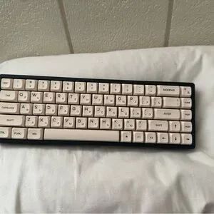 Sleek compact keyboard with cream keys and black frame. Ideal for efficient typing.