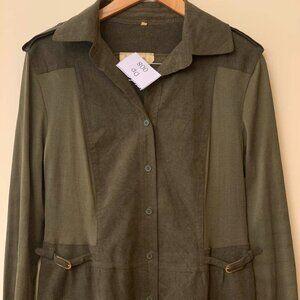 Khaki Green (Made in Switzerland) vintage long coat with ribbed details and front buttons.