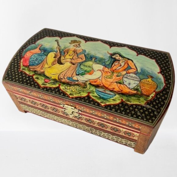 This Khatam Wood Marquetry box features a beautiful painting on the lid, making it a unique piece of art. It can be used by itself as a piece of art and is also a good size for storing jewelry and other items. The interior and underside are lined with red velvet-like fabric. The box is rectangular with rounded ends.
