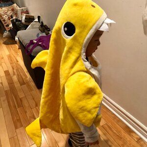 DOO DOO DOO! 🎶 Get this adorable, cozy Yellow Baby Shark Jumpsuit Costume, size Toddler 3T-4T (Small)! Unlike the typical foam tunics, this is a soft, plush, one-piece suit with an attached hood, making it perfect for keeping your little one warm while trick-or-treating. It features a full zipper for easy dressing and adorable fin and tail details.