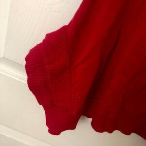 Festive Christmas Red knit with a unique Cat Sequin Appliqué on the chest (all sequins intact). Features a flirty Ruffled Hem and rhinestone initial "D" on the sleeve. Excellent condition. Perfect for Holiday Pictures, Christmas parties, or special Winter occasions.