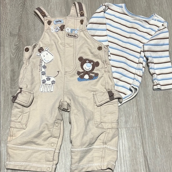 Adorable beige overalls featuring playful animal prints. Perfect for your little one's adventures. Shirt has untreated stains