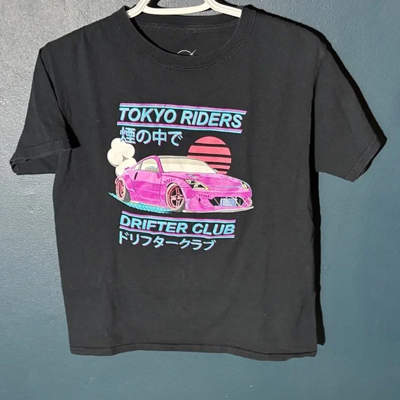 This stylish black tee features a vibrant Tokyo Riders design, perfect for young trendsetters.