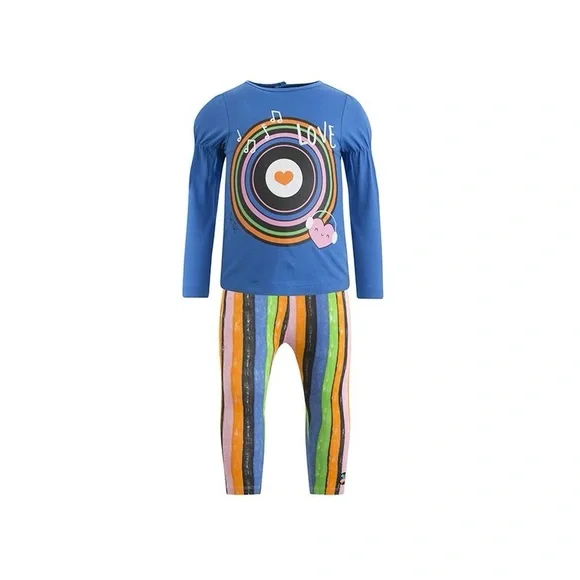 Brighten up your child's wardrobe with this vibrant matching set. Featuring a blue top with playful designs and multicolored striped pants, this set is perfect for fun and play. Comfortable and stylish, it's a must-have for any kid's collection.