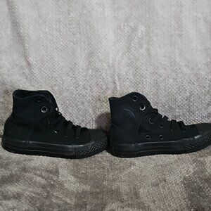 Stylish black high-top sneakers. Perfect for casual wear. Easy on with velcro on either side. Some of the grommets have wear.