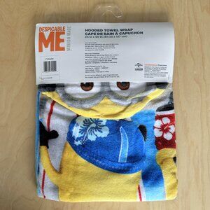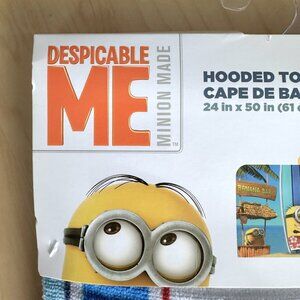 This Despicable Me Mega Minions kids' hooded towel wrap is made of 100% cotton and is brand new. It measures 24 inches in width and 50 inches in length. The design features the Mega Minions, beloved characters from the Despicable Me movie.
