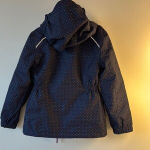 Stylish and comfortable navy blue jacket and rain pants with polka dots, perfect for kids. Features a hood for added protection. Ideal for spring weather
