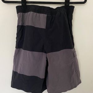 Black and grey blocked swim truck with logo on the bottom right leg. Additional pockets on either side and cargo pocket.