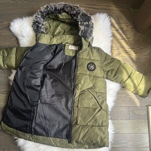 This is a super cozy kids' puffer coat in a lovely olive green colour. It features a faux fur-trimmed hood to keep your little one extra warm. Perfect for those chilly Canadian days!