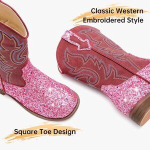 【Glitter Cowgirl Boots】: Decorated with classic embroidery and complemented with a glitter design, these stylish western boots bring cowboy style to your child. The wide boot opening and pull-tab design make these cowboy boots easier for children to put on and take off by themselves.