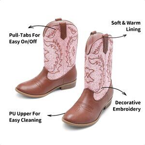 Kids Pink/Brown Cowgirl Boots Girls Cowboy Western Mid Calf Pull-On Riding Boots