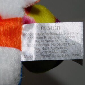 This adorable hard to find Character from 2007 David McKee Kids Preferred 8.5" Plush stuffed ELMER the Patchwork Elephant is in great clean bright soft condition with tush tag still attached at rear. Measures 8.5" long and 6" Tall. ** Note that this plush does have "beans" Pellets in the bottom of his belly and his feet to give him a cuddly feel.
