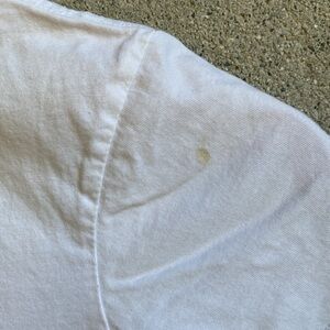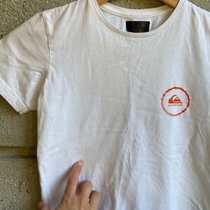 Classic minimalist kids Quiksilver tee. Used by son in a casual summer golf tournament when he was younger. Two small marks pictured and accounted for (have not tried to Oxy clean them at the time of this post ), they are very faint but buyer please note. Also pictured some minor crackle to the orange graphic
