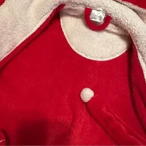 Super soft red plush, white trip, pom Pom on hat and belt.