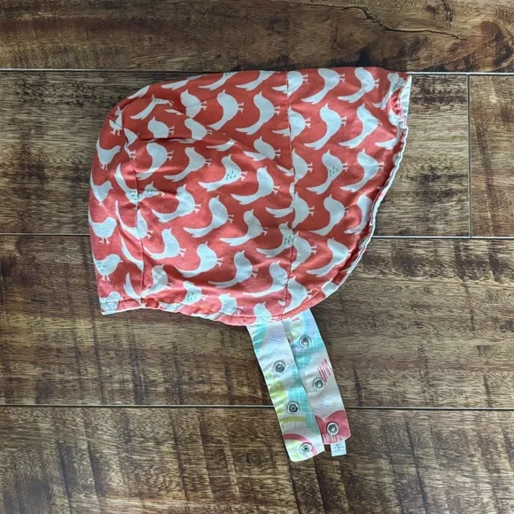 Adorable kids bonnet featuring a vibrant orange and white pattern. Perfect for adding a pop of color to any outfit and keeping the sun off your little one’s face. Fits best for 1-2 year olds!