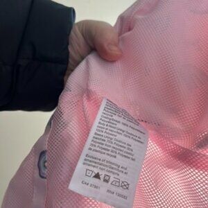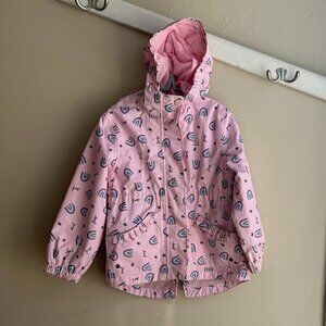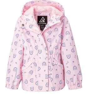 Kids Ripzone waterproof raincoat, size 5T, in light pink with playful rainbow and star pattern. Breathable, water-repellent, and perfect for keeping little ones dry and comfortable on rainy days.