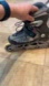 These stylish kids rollerblades feature adjustable straps for a secure fit. The sleek gray design is perfect for active play. A bit scuffed from use, but they work great still. Stored inside at all times.