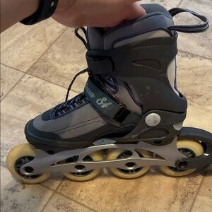 These stylish kids rollerblades feature adjustable straps for a secure fit. The sleek gray design is perfect for active play. A bit scuffed from use, but they work great still. Stored inside at all times.