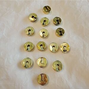 15 piece LOT gold coloured plastic slip-on button safety covers with fun children's cartoon dinosaur and water toys printed on them.