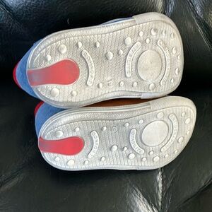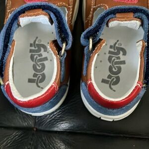Made in France. Antiskid soles, soft leather inner sole. Great condition. Bottom soles are partly grayish from normal wear and tear. These stylish kids shoes feature a playful combination of brown and blue, perfect for any adventure. Designed for comfort and durability, they are a great addition to your child's wardrobe.
